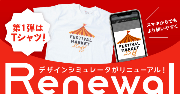 リニューアルされた新しいデザインシミュレータにはTシャツプリントのみ対応ですが、今後は全商材でリニューアルを実施していきます。