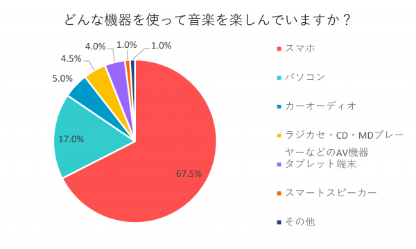 最も多かったのが「スマホ」で67.5%、次いで「パソコン」17%、カーオーディオ「5%」、「ラジカセ・CD・MDプレーヤーなどのAV機器」4.5%、「タブレット端末」4%、「スマートスピーカー」1%、「その他」1%でした。