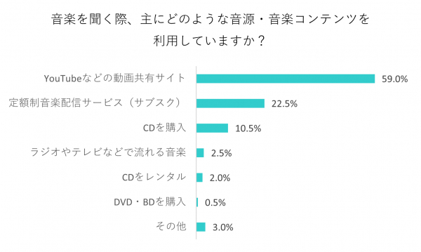「YouTubeなどの動画共有サイト」が59%、「定額制音楽配信サービス(サブスク)」が22.5%、「CDを購入」が10.5%、「ラジオやテレビなどで流れる音楽」が2.5%、「CDをレンタル」が2%、「DVD・BDを購入」が0.5%、「その他」が3%でした。