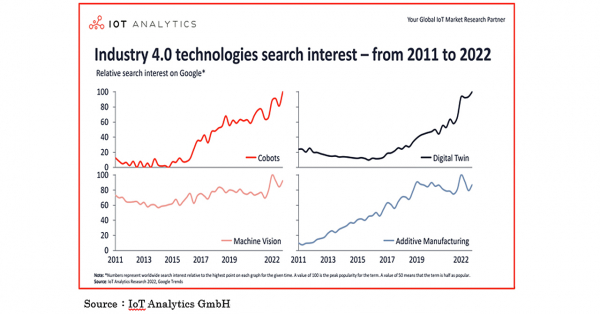 2011年以降、「Cobot」は10倍、「Additive Manufacturing」は約9倍、「Digital Twin」は4倍、「Machine Vision」は1.3倍に検索件数が増加しています。