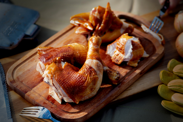 福岡県産銘柄鶏「はかた一番どり」の中でも、脂ののった大きめの鶏を厳選し、ほんのり甘く香るさくらの原木を使用し、贅沢に一羽丸ごとハードスモークしました。