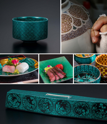 ご子息の雅夫さんは、精緻な呉須の線描と掻き落としで独特な質感の下地を作り、その上に緑釉を塗る「緑彩」をはじめとする技法で、現代の新しい表現に取り組んでいます。近年は、忠夫さんの色絵細描技法の継承にも力を注いでいます。2022年には第4回三井ゴールデン匠賞を受賞。職人・作家としての技術力の高さだけでなく、「本物の九谷焼」を広く知らせる活動から産地全体への貢献度が高く評価されました。