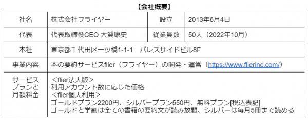 株式会社フライヤーは、本の要約サービス「flier(フライヤー)」を運営する、ITベンチャー(2013年6月設立)です。最大の特長は「書評(レビュー)」ではなく「要約」である点です。書き手の主観が入る書評とは異なり、著者の主張や論理(重要ポイントや全体像)を忠実にまとめ、読者に伝えます。書評でないため、出版社と著者から要約の許可を得る必要があり、要約した原稿にも目を通していただくことで、高品質なサービスを提供しています。