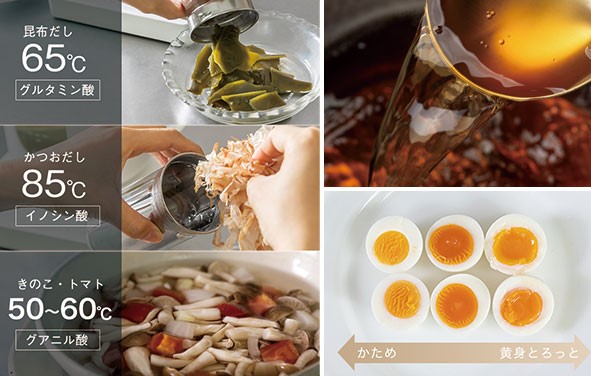 2つの機能でうまみ成分であるグルタミン酸、イノシン酸、グアニル酸などが溶け出しやすいと言われる温度と適正な時間を容易に管理できるため、和食の基本となる「だし」や素材から出るうまみや食感を上手に引き出した「スープ」、温度調整が難しい「温泉卵・ゆで卵」をお好みの固さに、サラダチキンを低温でしっとり柔らかくなど、様々な調理をサポートします。