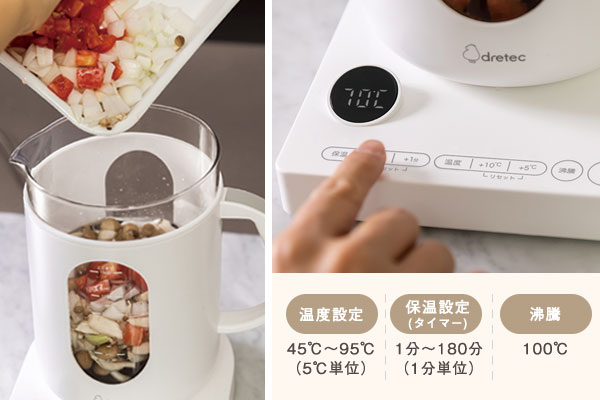調理ポット「ククポ」は45℃~95℃までの保温設定と沸騰の計12パターンの「温度設定機能」と1分単位で最大180分まで設定可能な「タイマー機能」の2種類を搭載しています。