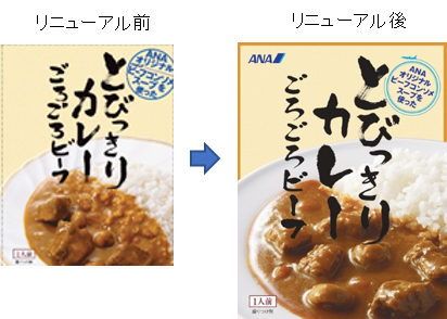 シリーズ商品が増えたこのタイミングで『ANAオリジナルビーフコンソメスープを使った とびっきりカレーごろごろビーフ』のパッケージを販売開始以来、初めてリニューアル。明るい色合いと大きな文字に親しみやすさがあり、印象に残るパッケージです。新パッケージでも、これまでのスッキリとしたイメージは変えることなく、親しみやすさの中にも高い品質にこだわる「ANA」らしさを、2色のブルーをアクセントに、ANAのロゴと飛行機のイラストを配置し表現しています。
