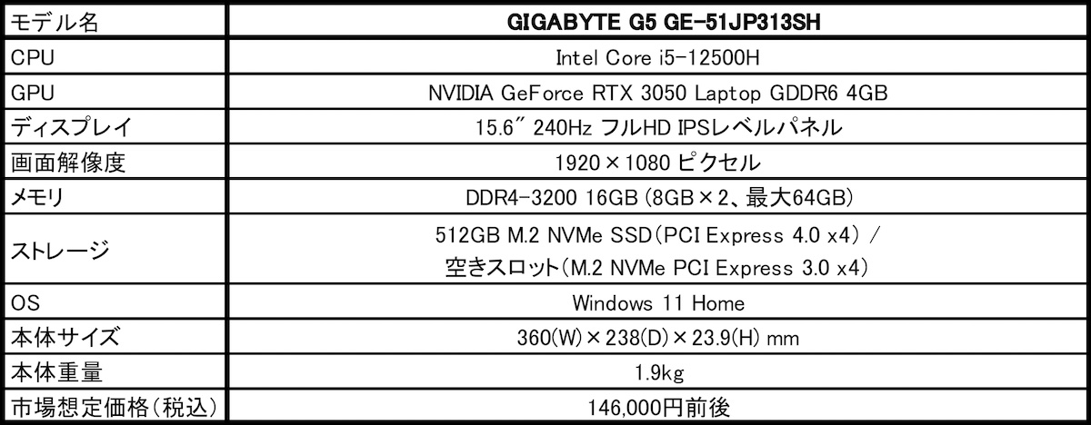 2022年11月11日 - GIGABYTE Technology Co., Ltd. 台湾・新北市 - コンピュータテクノロジーで世界をリードするGIGABYTE Technologyは、CPUに第12世代Intel Core i5プロセッサ、GPUにNVIDIA GeForce RTX 3050をそれぞれ搭載し、リフレッシュレート240Hzの液晶パネルを採用したエントリー向け15.6型ゲーミングノートPC「GIGABYTE G5 GE-51JP313SH」をGIGABYTEノートPC取扱店を通して11月12日より販売開始いたします。市場想定価格(税込)は、146,000円前後です。
