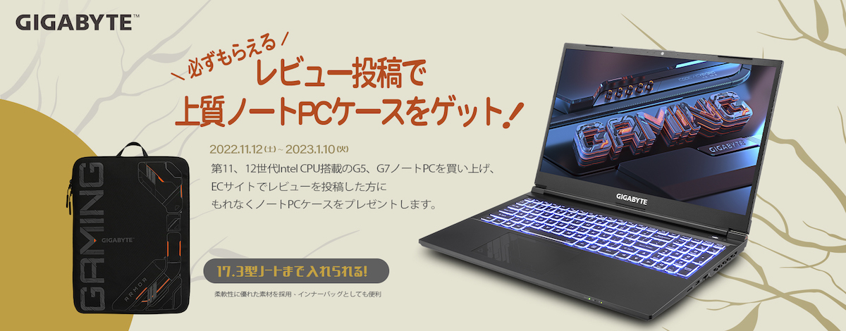 2022年11月12日~2023年1月10日の期間中に第11・12世代Intel CPU搭載のG5・G7シリーズを購入し、Amazon.co.jpや価格.com、ショッピングサイトなどに100文字以上の製品レビューを投稿してくださったユーザーを対象に、ノートPC用ケースをもれなくプレゼントするレビューキャンペーンを実施いたします。キャンペーン登録期間は、2022年11月12日~2023年1月24日です。応募方法などの詳細につきましては、下記キャンペーンページをご参照ください。