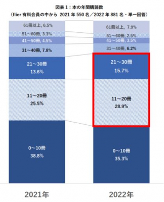 ・2021年のデータと比較すると、0~10冊と回答した人が減少し、11~21冊、21~30冊と回答する人が増加。昨年と比較し年間購読数が増えている。