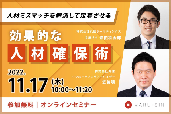 株式会社丸信は、11月17日(木)に、人材確保の方法や当社の人材採用サポート体制について紹介する無料Webセミナー「人材ミスマッチを解消して定着させる、効果的な人材確保術」を開催いたします。
