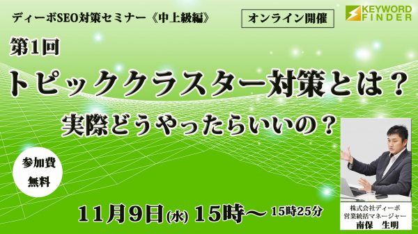 初回となる今回のSEO対策セミナー《中上級編》は、テーマを「トピッククラスター対策とは?実際どうやったらいいの?」と題して講義します。
