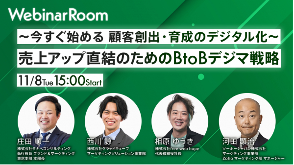 ビジネスマンの役に立つ動画がいつでも無料で観られるウェビナープラットフォーム「Webinar Room(ウェビナールーム)」(https://webinar-room.net/)を運営する株式会社ヒトクセは、2022年11月8日(火)15:00~に株式会社タナベコンサルティング、株式会社グラッドキューブ、株式会社free web hope、ゾーホージャパン株式会社との”~今すぐ始める 顧客創出・育成のデジタル化~ 売上アップ直結のためのBtoBデジマ戦略”をテーマに共催ウェビナーを開催します。