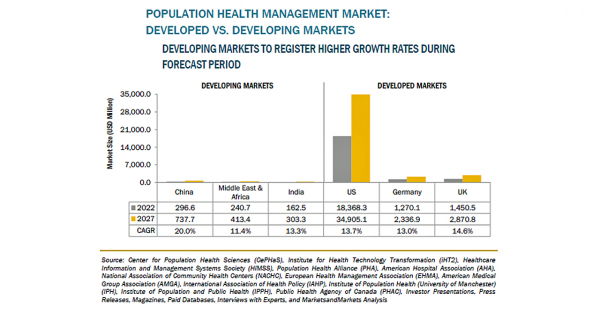 集団健康管理(PHM)の市場規模は、2022年の278億米ドルからCAGR13.9%で成長し、2027年には533億米ドルに達すると予測されています。同市場の成長は、地域医療を改善するための政府の取り組み、患者数、老人人口、それぞれが増加していることと、医療費抑制のニーズの高まりなどが要因となっています。しかし、熟練したIT専門家の不足や高額なインフラ投資が、同市場の成長をある程度抑制するものと思われます。同市場は、コンポーネント、デリバリーモード、エンドユーザー、地域別に、分類されています。