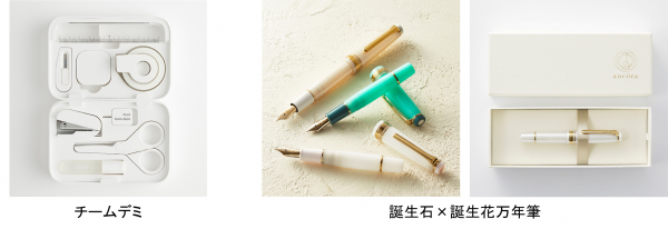 プラスの文具からは、持っているだけで楽しくなるステーショナリーセット「チームデミ」をはじめ、デザインにこだわったアイテムを展示販売。プラスとセーラー万年筆が共同で運営する銀座のショップ「ancora(アンコーラ)」から、ancora限定の人気シリーズ「誕生石×誕生花万年筆」もご紹介します。