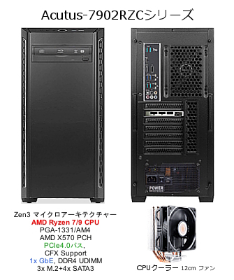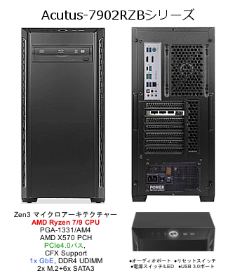 Acutus-7902RZシリーズは、PGA1331ソケット(ソケットAM4)対応のZen3マイクロアーキテクチャーによる第4世代AMD Ryzen 7およびRyzen 9 CPUを搭載したワークステーションで、2台の3.5/2.5インチドライブベイと2台の/2.5インチSSDベイを装備しています。両サイドパネルは、静音性を向上する2重構造の吸音材によりデッドニングされています。