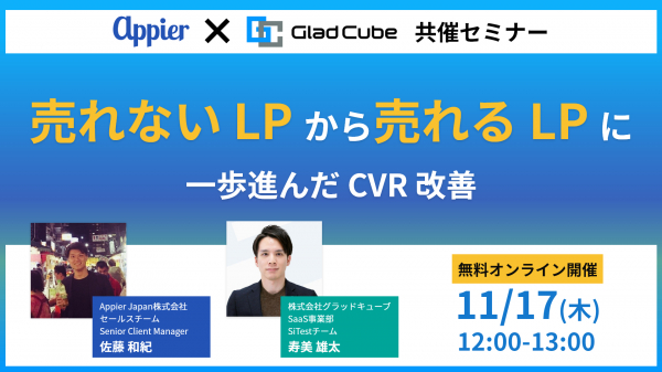 株式会社グラッドキューブ(本社:大阪市中央区 代表取締役 CEO 金島 弘樹 以下:グラッドキューブ)は、Appier Japan株式会社(本社:東京都港区 代表:游 直翰)と共催で、11月17日(木) 12:00~ LP(ランディングページ)に課題をお持ちの事業者様向けにオンラインセミナーを開催いたします。