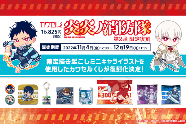 株式会社インクルーズ(東京都渋谷区、代表取締役社長 山﨑 健司)が企画・運営するオンラインくじ「カワセルくじ」にて、11月4日(金)より、『炎炎ノ消防隊』第2弾のくじが【復刻版】として再販開始になりましたことをご報告させていただきます。