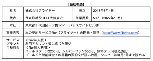 (株)フライヤーは、本の要約サービス「flier(フライヤー)」を運営する、ITベンチャー(2013年6月設立)です。最大の特長は「書評(レビュー)」ではなく「要約」である点です。書き手の主観が入る書評とは異なり、著者の主張や論理(重要ポイントや全体像)を忠実にまとめ、読者に伝えます。書評でないため、出版社と著者から要約の許可を得る必要があり、要約した原稿にも目を通していただくことで、高品質なサービスを提供しています。