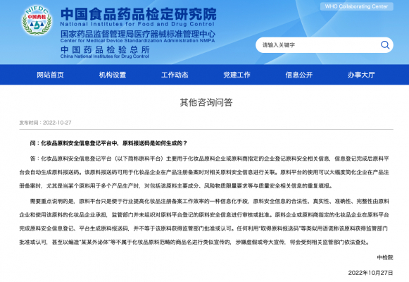 回答:化粧品原料安全情報登録プラットフォーム(以下、原料プラットフォーム)は、主に化粧品原料生産企業、もしくは原料生産企業が指定する企業が原料安全関連情報を登録するために利用され、情報登録が完了すると、原料プラットフォームは、自動的に原料伝達コードを生成する。この原料伝達コードは、化粧品企業が製品のNMPA申請時に該当する原料と原料安全関連情報とを連携するために使用できる。原料プラットフォームの使用は企業が製品のNMPA申請の際に、また、特にある原料が複数の製品に使用される場合、当該原料の主成分、リスク物質の制限要件などの品質安全関連情報を繰り返し提出することを大幅に簡略化できる。