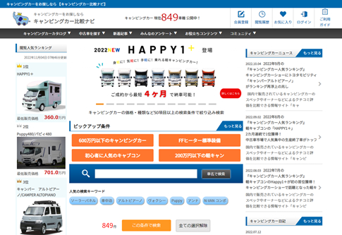 当サイトは、これからキャンピングカーの購入を検討されている方へ向けた日本最大級のキャンピングカーの比較サイトです。国内・海外を含む800台以上のキャンピングカーを、価格や車両サイズ、就寝人数やオプション装備など、約60種類の項目からスペック比較ができ、どのキャンピングカーが人気かを一定期間の閲覧数を基にランキング形式で表示。