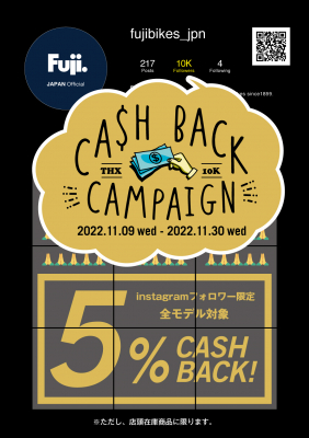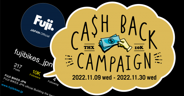 内容:FUJIのインスタグラムアカウント @fujibikes_jpn のフォロワー10000人達成を記念して、フォロワー様を対象にした「キャッシュバックキャンペーン」実施いたします。