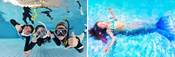 憧れの人魚になろう! 最近テレビやインスタなどでも注目を集めているマーメードスイムをプールで体験できます。フリーダイビングと共通する素潜り、息止め状態で水中を楽しむレジャースポーツ。フリーダイビングとは違った難しさ、スキルもあるため、しっかりインストラクターが教えてくれます