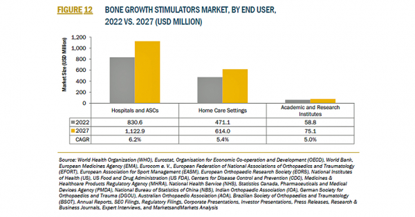 骨成長刺激装置の市場規模は、2022年の14億米ドルからCAGR5.9%で成長し、2027年には18億米ドルに達すると予測されています。脊椎固定手術用途における骨成長刺激装置の需要の増加、非外科的・非侵襲的治療に対する嗜好の高まりが、同市場の成長を促進しています。骨成長刺激装置市場は、製品、用途、エンドユーザー、地域別に分類されます。