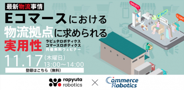 eコマースの自動化型DXサービスを提供する株式会社コマースロボティクス(本社:東京都港区、代表取締役:伊藤彰弘)は、2022年11月17日(木)にAMRピッキングソリューション提供するラピュタロボティクス株式会社(東京都江東区、 代表取締役 CEO:モーハナラージャー・ガジャン)と共催で無料ウェビナー【最新物流事情】「Eコマースにおける物流拠点に求められる実用性」を開催いたします。