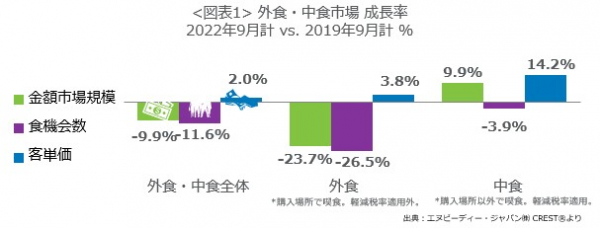 外食・中食市場の2022年9月は、売上9.9%減(2019年同月比)