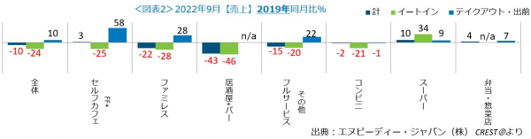 業態別・利用形態別の9月の売上2019年同月比をみると(図表2)、外食・中食全体のイートインは同23.7%減で、前月より回復しました(前月比3.7ポイント増)。業態別では、FF+セルフカフェのテイクアウト・出前が同58%増で、前月より14ポイント増でした。