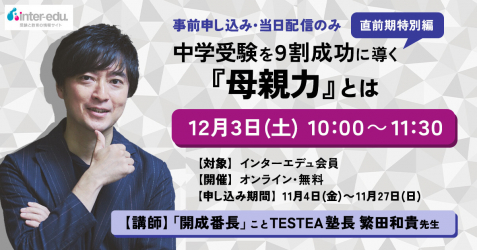 日本最大級の受験教育情報サイト「インターエデュ・ドットコム」は、2022年12月3日(土)に、TESTEA(テスティー)塾長 繁田和貴先生によるオンラインセミナーを開催します。9月にも開催し、好評を博したセミナーを≪直前期特別編≫としてバージョンアップした内容でお届けします。
