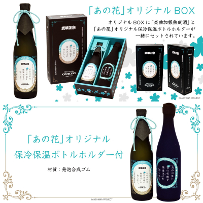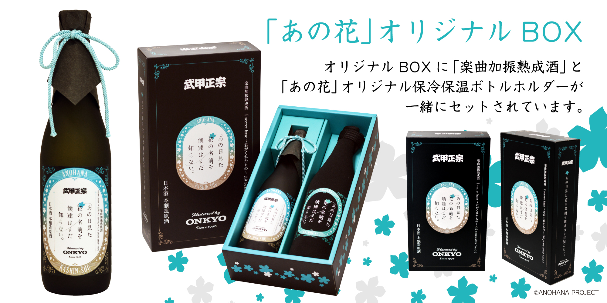「あの花」加振酒の特徴ですが、「武甲正宗」をベースとしており、TVアニメ「あの日見た花の名前を僕達はまだ知らない。」エンディングテーマ「secret base ~君がくれたもの~(10 years after Ver.)」※2をホーロータンクに取り付けた加振器により、熟成期間中24時間30日間じっくり聴かせ熟成させました。当社技術ノウハウの証として、”Matured by Onkyo”が付与されております。本醸造原酒、精米歩合70%、アルコール度数19%、オリジナルカラーの和紙カバー・組紐付きの四合瓶720mlに、発泡合成ゴム素材のあの花オリジナル保冷保温ボトルホルダーを付属。国産の豪華パッケージ(BOX箱)となっております。ラベル・ボトルホルダー・パッケージ共に、あの花の世界観をイメージしたデザインとなっております。