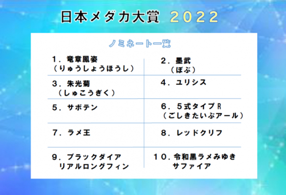 今年、SNSやユーチューブ、マスメディア等で話題になったメダカのうち、ファン投票により、グランプリを決定します。