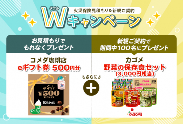 火災保険の新規加入をご検討されている方や火災保険の満期が近づいている方、この機会に是非弊社の見積もり&成約Wキャンペーンへご参加ください。