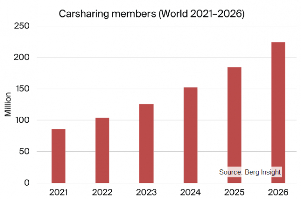 Berg Insightは世界のカーシェアリング会員数は2021年末に8,600万、2026年までに2 億 2,430 万へ達し、CAGR21.1%で成長すると予測しています。