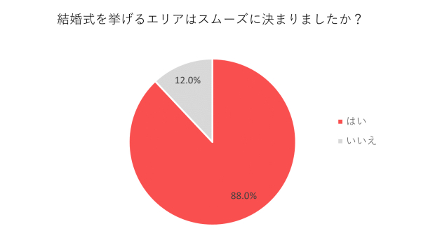 「はい」が88%、「いいえ」が12%でした。多くの人が結婚式のエリアをスムーズに決めることができたようです。