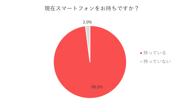 「持っている」が98%、「持っていない」が2%という結果に。ほとんどの人がスマホを所持していることが明らかになりました。スマホは生活から切り離せない存在になりつつあるようです。