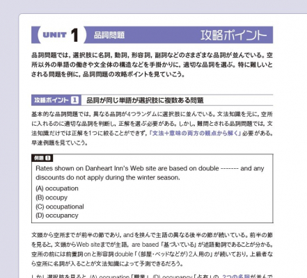 本書は問題タイプ別に8ユニットで構成されています。各ユニットの冒頭では、高得点者でも見落としがちな難問のポイントを、例題を交えながら解説しており、要点を確認してから問題演習に取り組む流れとなっています。