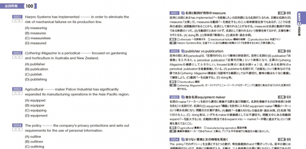 本書は満点取得を阻む「壁」となりがちなPart 5(短文穴埋め問題)の対策に特化した問題集で、高得点者でも見落としがちなポイントを選りすぐり、文法問題500問、語彙問題500問、計1000問を収録しています。
