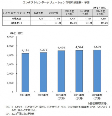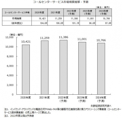 コールセンターサービス市場の2022年度上期までは官公庁関連のスポット案件が続いているものの、下期は落ち着くものとみられ、2023年度以降の市場規模は、揺り戻しが発生すると予測する。