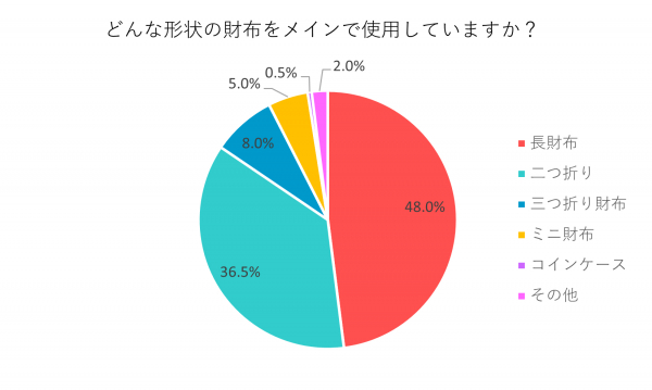 最も多かったのが「長財布」で48%、次いで「二つ折り」36.5%、「三つ折り財布」8%、「ミニ財布」5%、「コインケース」0.5%、「その他」2%という結果になりました。