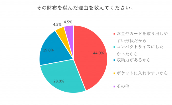 「お金やカードを取り出しやすい形状だから」44%、「コンパクトサイズにしたかったから」28%、「収納力があるから」19%、「ポケットに入れやすいから」4.5%、「その他」4.5%でした。