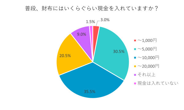 「~1,000円」3%、「~5,000円」30.5%、「~10,000円」35.5%、「~20,000円」20.5%、「それ以上」9%」、「現金は入れていない」1.5%でした。