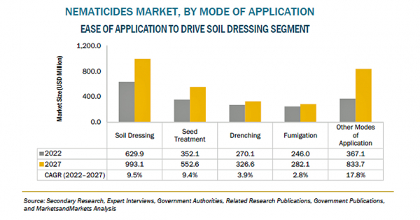 殺線虫剤の市場規模は、2022年の19億米ドルからCAGR9.9%で成長し、2027年には30億米ドルに達すると予測されています。植物寄生性線虫は、作物栽培の成否、生産性、と作物生産全般において生物学的ストレスとなります。作物の収量に直接的な損失を与えるだけでなく、他の病原菌を含む複合病害の発生源のひとつとなっています。