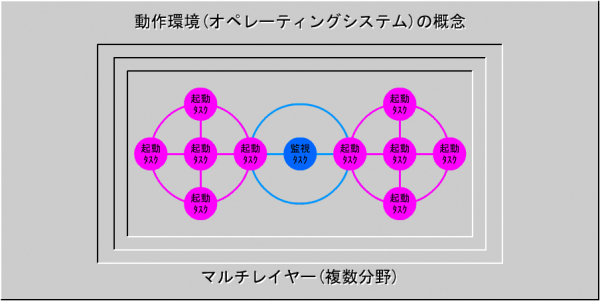 制御系OS(TRON)とビジネス系OS(Windows)の利点を融合して進化させたOSで、マルチレイヤー(複数分野)、マルチタスク(起動タスク)、監視タスク(ラウンドロビン)、で構成されています。