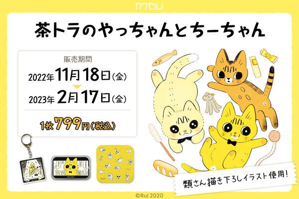 株式会社インクルーズ(東京都渋谷区、代表取締役社長 山﨑 健司)が企画・運営するオンラインくじ「カワセルくじ」にて、11月18日(金)より、「茶トラのやっちゃんとちーちゃん」のくじが発売開始になりましたことをご報告させていただきます。