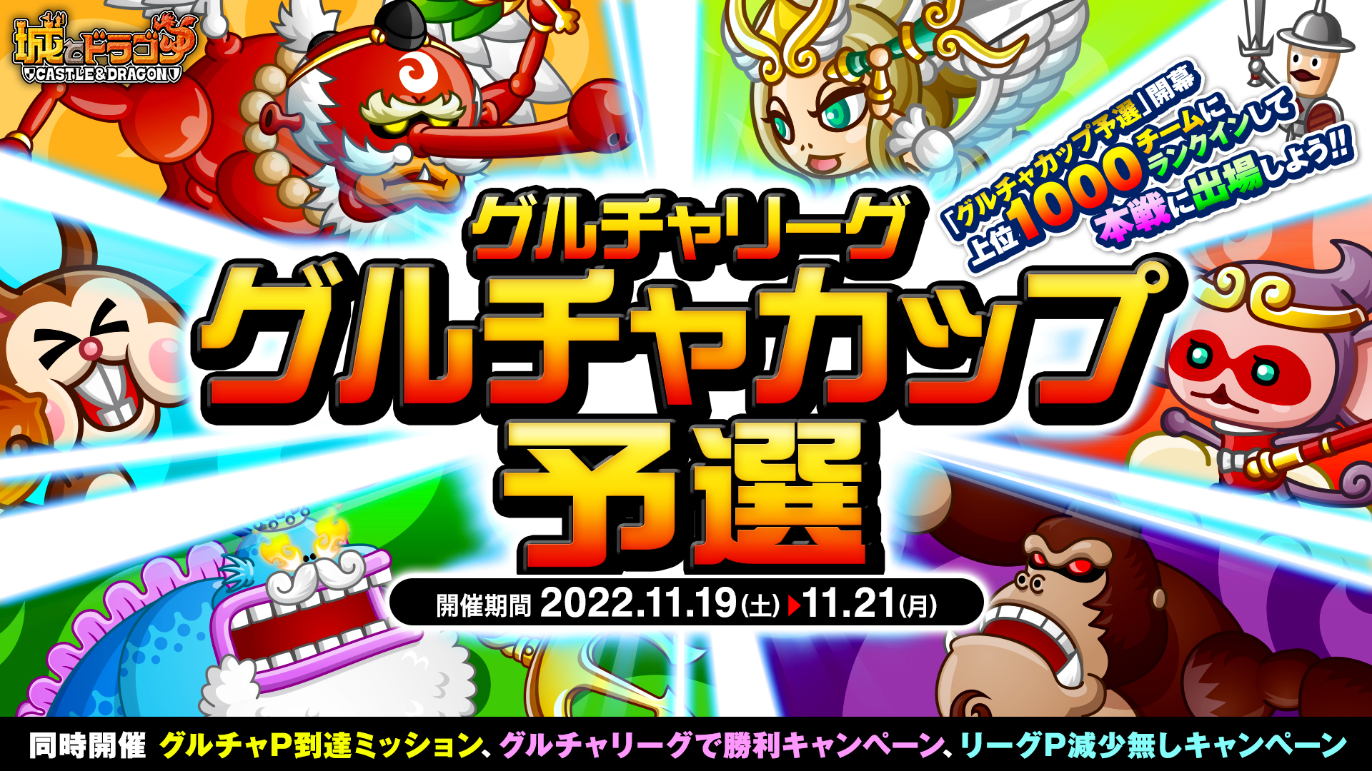 11月20日(日)12時より、「城ドラバトルフェス2022 腕くらべOFF ソログ戦トーナメント11月大会」をトーナメントプラットフォーム「トナメル」にて開催!大会の様子は、城とドラゴン公式YouTubeチャンネルでライブ配信いたしますので、ぜひ生で熱い試合を観戦しましょう!また11月19日(土)より、ゲーム内にてグループチャットのメンバーと協力して“グルチャP”を競う「グルチャリーグ」が開催。ランキングに応じて、レアアバター券やドラゴンメダルの報酬が手に入ります。また、今回はランキング上位1000チームが次回開催の「グルチャカップ」へのエントリー資格を得られる予選も併催。メンバーと協力して、上位1000チームを目指しましょう!