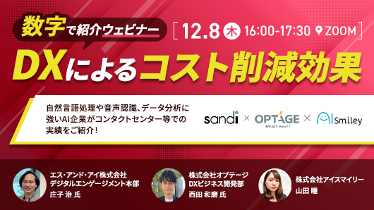 企業のDXを推進する国内最大級の AI ポータルメディア「AIsmiley」を運営するアイスマイリー(東京都渋谷区、代表取締役:板羽晃司)は、2022年12月8日(木)16時から「DXによるコスト削減効果」をテーマにウェビナーを開催します。