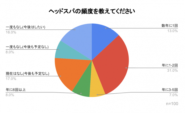 「ヘッドスパの頻度を教えてください」の質問では、『数年に1回』が13%、『年に1-2回』が31%、『年に3-5回』が7%、『年に6回以上』が8%、『過去にしたことはあるが、現在はなし(今後も予定なし)』が17%、『一度もなし(今後も予定なし)』が8%、『一度もなし(今後はしたい)』が16%という結果となり、半数以上が定期的にヘッドスパをしていることがわかりました。