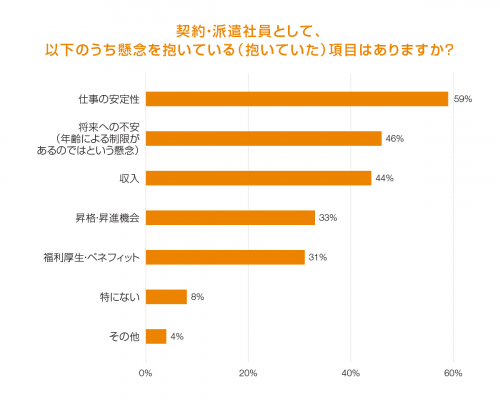 労働者不足の日本では、企業が契約・派遣社員が働いている際に抱える課題や不安を一つでも多く取り除いていくことが重要です。労働者不足対策としてだけではなく、すべての人が働きやすい環境づくりにつながるからです。また、人材不足の日本で優秀な契約・派遣社員を採用することは、企業が不安定な経済状況を生き抜く鍵でもあります。そこで契約・派遣社員として就業中に抱いたことのある懸念・課題を聞くと、「仕事の安定性」(59%)が1位にあがりました。2位「将来への不安(年齢による制限があるのではという懸念)」(46%)、3位「収入」(44%)でした。